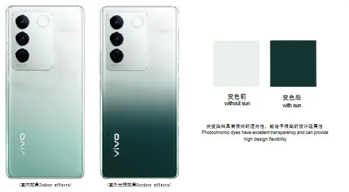Philchromic ပစ္စည်းသည် Microscapsuls တွင် microlecapsules များတွင် MicronSposules တွင်ဆေးကြောသန့်စင်ခြင်းများကိုထုပ်ပိုးခြင်းဖြင့် Micronscapsules တွင် MicronStiolet ၏စွမ်းအင်ကိုစုပ်ယူနိုင်ပြီး Sunlight (ခရမ်းလွန်ပုံစံပြောင်းလဲခြင်းကိုစုပ်ယူနိုင်ပြီးစုပ်ယူအလိုင်း၏အပြောင်းအလဲများဖြစ်ပေါ်စေနိုင်သည်။ နေရောင်ခြည် (ခရမ်းချဉ်သီး) စွမ်းအင်ပျောက်ဆုံးသောအခါ၎င်းသည်မူရင်းမော်လီကျူးဖွဲ့စည်းပုံသို့ပြန်သွားပြီးမူရင်းအရောင်ကိုပြန်လည်ရရှိစေသည်။ လက်ခဏာ: